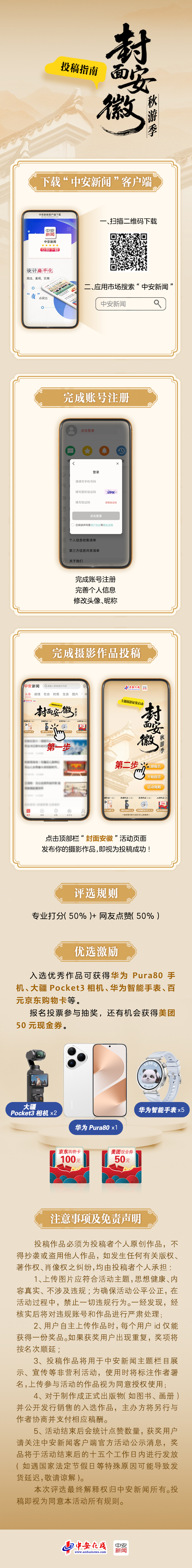 5、評選與展示:征集結束后,中安新聞客戶端將組織專家評審團對作品進行評選(專業打分+作品傳播效果),擇優在客戶端“封面安徽”專欄進行展示,并推薦部分優秀作品至安徽省主流媒體平臺刊發。